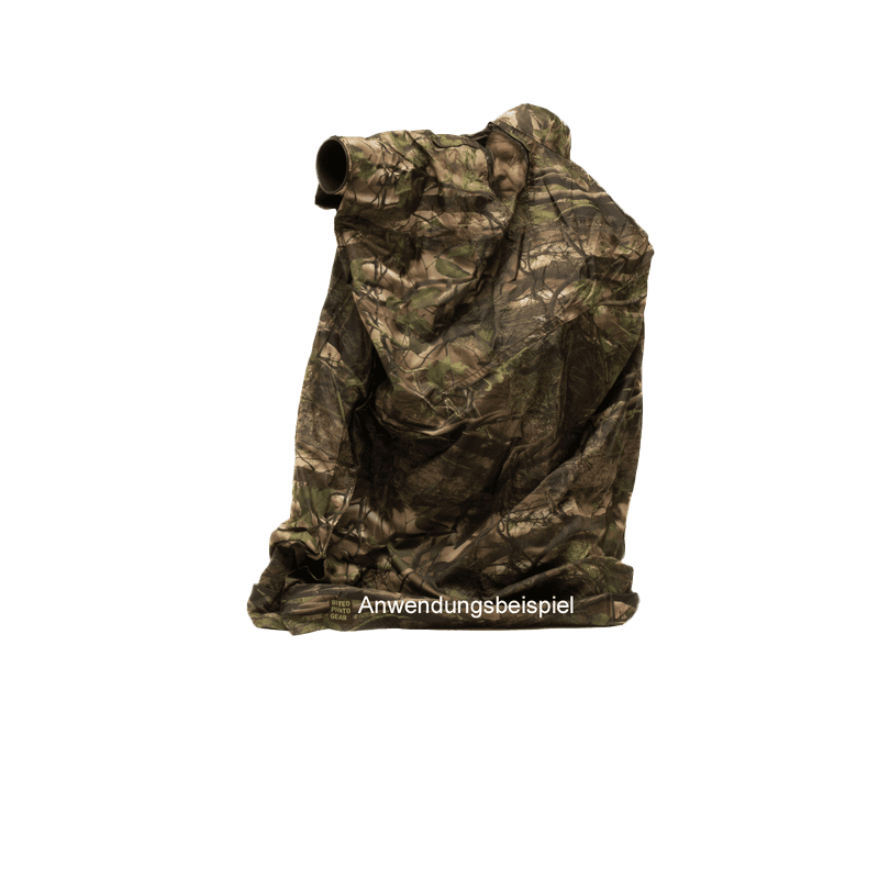 Das robuste Polyestergewebe (150D) mit einer Wassersäule von 2.500 mm schützt zuverlässig vor Regen und Feuchtigkeit – ideal für wechselhaftes Wetter. Tipp: Stellen Sie sich möglichst unter oder neben bestehende Vegetation, um die Tarnung zu optimieren. Nur das Sichtfenster ist nicht wasserdicht.