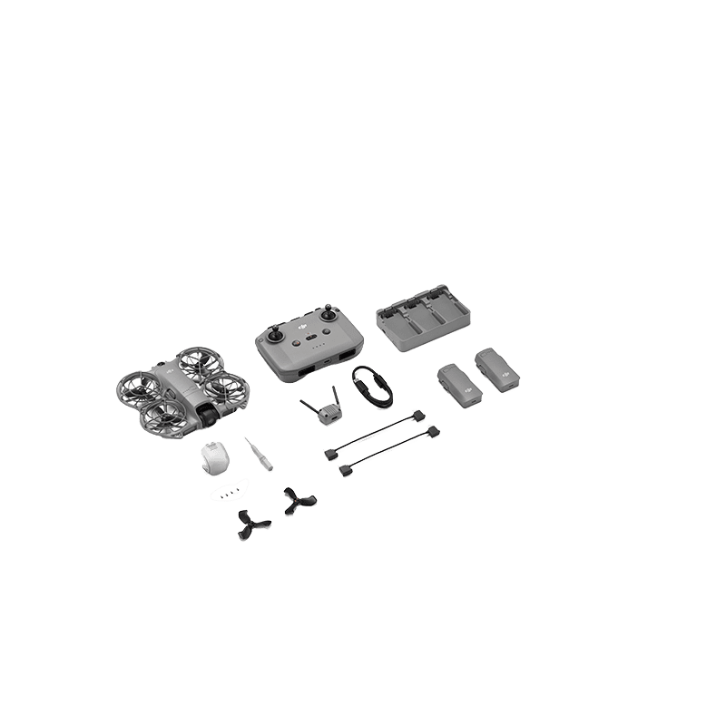 DJI Neo 2 Fluggerät, DJI RC-N3 Fernsteuerung, DJI RC-N Serie Fernsteuerungskabel (USB-C), DJI RC-N Serie Fernsteuerungskabel (Lightning), DJI Neo 2 Intelligent Flight Battery 3x, DJI Neo 2 Zweiwege-Ladestation, DJI Neo 2 Ersatzpropeller (Paar), DJI Neo 2 Ersatzpropeller Schrauben 4x, Schraubendreher, DJI Neo 2 Propellerschutz (Paar), DJI Neo 2 Digitaler Sendeempfänger, DJI Neo 2 Gimbal-Schutz, USB-C auf USB-C Datenkabel