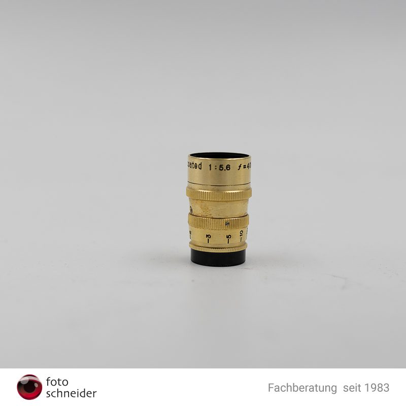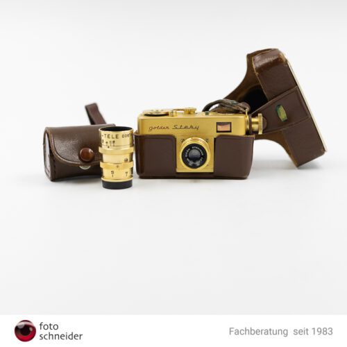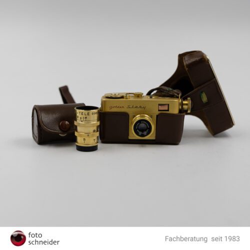 Auffällig ist der seitliche Filmtransporthebel, der das Spannen und Weiterschalten besonders komfortabel macht. Zusätzlich zum Standardobjektiv ist in diesem Set ein vergoldetes 40-mm-Teleobjektiv mit Lichtstärke f/5,6 enthalten, das als Wechselobjektiv montiert werden kann – eine seltene Ergänzung und ein echtes Highlight für Sammler.