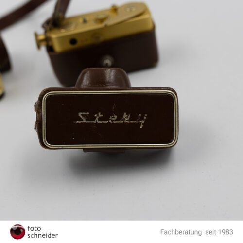 Die Steky Modell IIIb “Golden Edition” wurde zwischen 1955 und 1958 von der Riken Optical Company (heute Ricoh) in Japan hergestellt. Es handelt sich um eine hochwertige Subminiaturkamera für 16-mm-Film, speziell entwickelt für die sogenannte Doppelmuschelkassette. Dieses seltene Modell markiert den Übergang von der vertikal ausgerichteten Steky-Serie zur späteren Golden Ricoh 16.