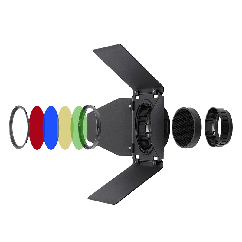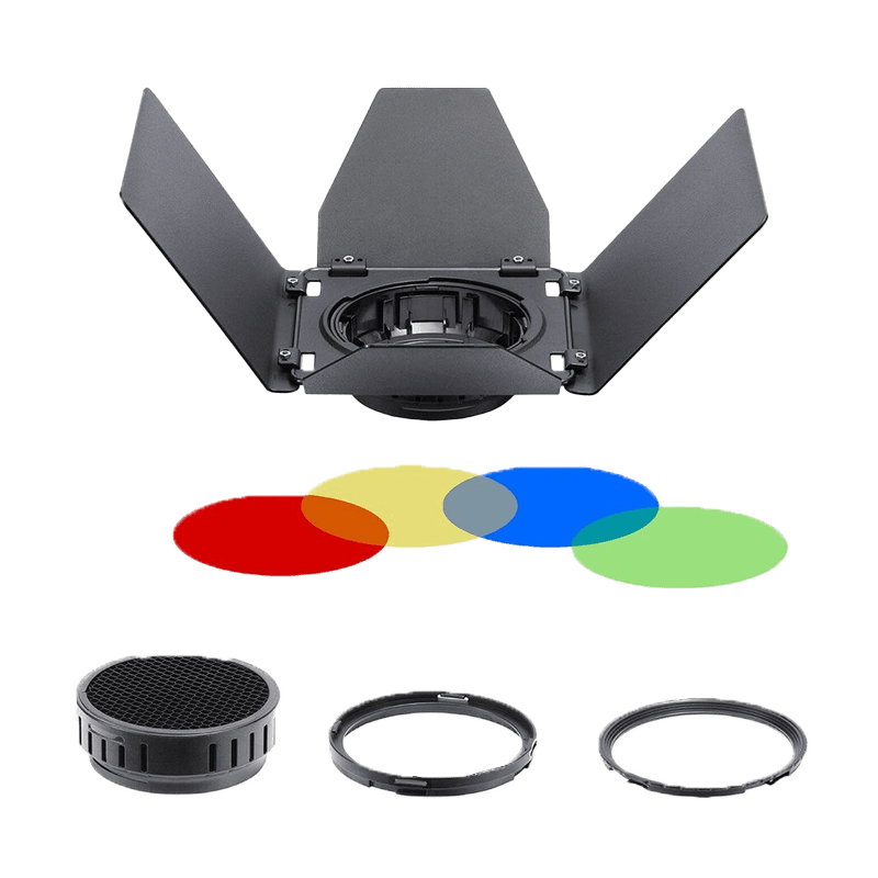 Der Barndoor verfügt über ein 4-Klappen-Design, mit dem sich der Lichtkegel des AD300 Pro präzise steuern lässt. Sie können das Licht exakt dahin lenken, wo Sie es brauchen. Im Set enthalten sind der Barndoor mit seinen vier verstellbaren Klappen, ein Diffusfilter sowie vier Farbfilter in Gelb, Grün, Rot und Blau – perfekt, um sofort spannende und farbige Lichteffekte zu erzeugen.