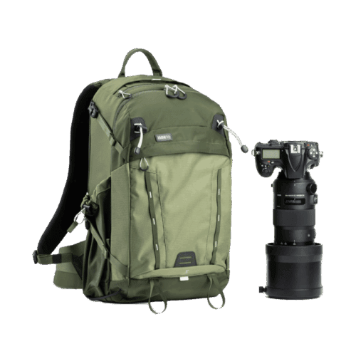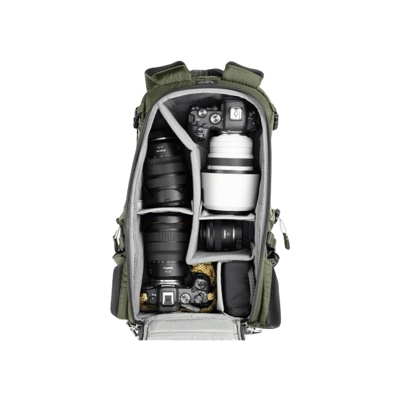 Der Rucksack bietet vielseitige Befestigungsmöglichkeiten wie Daisy Chains, Eispickel-Schlaufen und zusätzliche Punkte zur Erweiterung der Tragkapazität. Ein integriertes Stativ- und Monopod-System lässt sich vorne oder seitlich anbringen. Für Komfort sorgen ein gepolsterter Hüftgurt, ein verstellbarer Nackenriemen sowie ein Rückenteil mit Luftkanal und Lendenstütze. Zwei große Wasserflaschentaschen, seitliche Kompressionsriemen und vordere Stopftaschen bieten zusätzlichen Stauraum. Im Inneren schaffen verstellbare Trennwände Platz für Teleobjektive, Kameraausrüstung oder persönliche Dinge, ergänzt durch Mesh-Taschen für Filter, Kabel und Batterien. Hochwertige Materialien wie YKK® RC Fuse Reißverschlüsse und robustes 420D Nylon garantieren Langlebigkeit. Praktische Details wie ein oberes Reißverschlussfach, ergonomische Zipper und ein nahtversiegelter Regenschutz runden das Design ab. Zudem erfüllt der Rucksack die meisten internationalen Handgepäckbestimmungen.