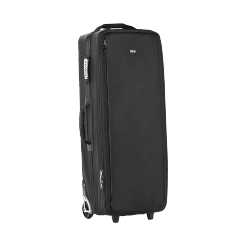 Die Seitenfächer nehmen Stative auf, die mit Stativgurten gesichert werden können. Der Trolley hat drei Tragegriffe und einen breiten Radstand für sicheren Transport. Der äußere Koffer ist mit wabenförmigen Panels und Ballistic Nylon verstärkt. Der Deckel lässt sich weit öffnen, und Netztaschen im Inneren bieten zusätzlichen Stauraum.