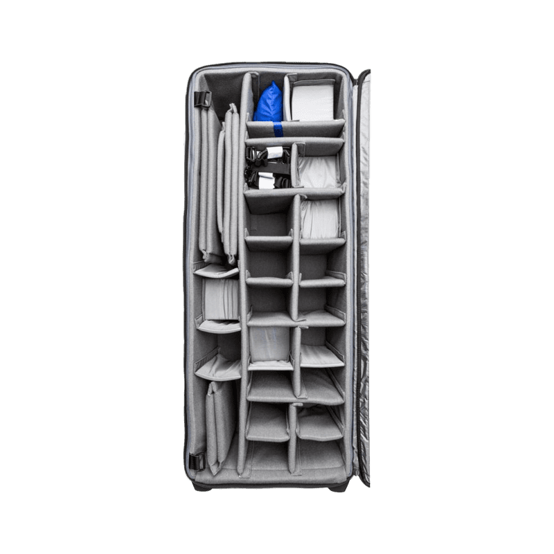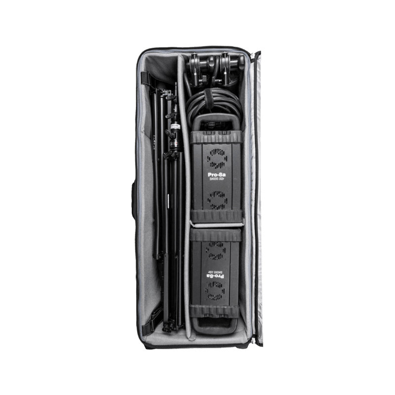 Der Trolley wurde für Fotografen entwickelt, die umfangreiche Ausrüstung wie Mittel- oder Großformatsysteme und Blitzanlagen transportieren müssen. Ideal für Werbe-, Hochzeits-, Event- und Sportfotografen, bietet der Production Manager™ 40 Platz für Akku-Generatoren, Blitzköpfe, Lampenstative, Reflektoren und mehr. Dank individuell einteilbarer Trennwände lässt sich der Innenraum flexibel anpassen. Eine große, dehnbare Vordertasche bietet Platz für Kabel, Reflektoren oder Laptops.