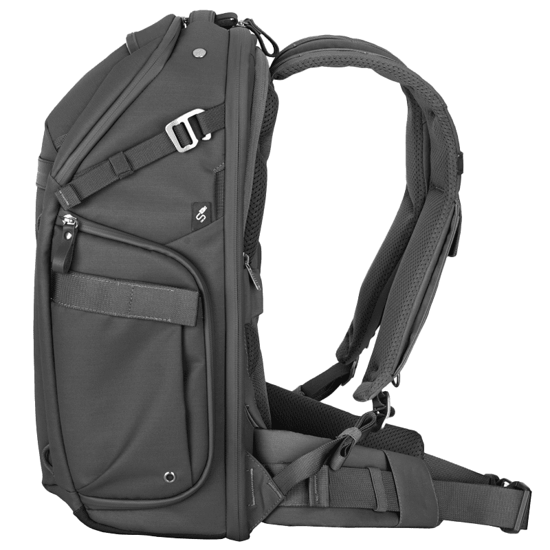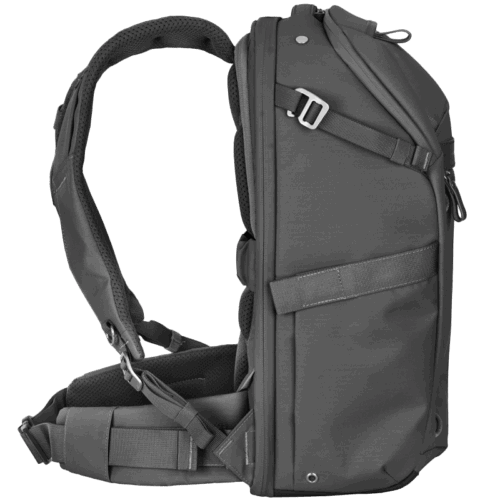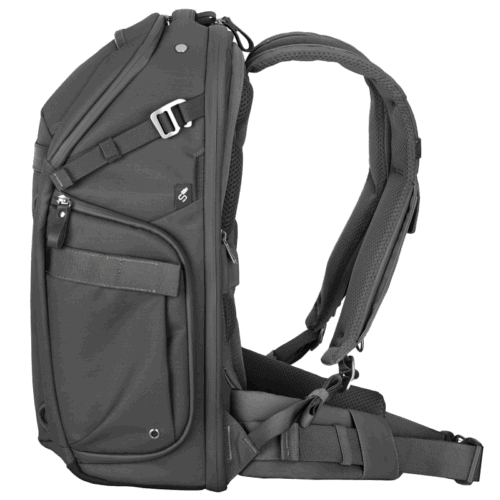 Der Rucksack verfügt über zahlreiche weitere Fächer, darunter erweiterbare Seitentaschen für Flasche oder Stativ, versiegelte Taschen für Speicherkarten und Zubehör sowie eine Smartphone-Tasche am Schultergurt. Ein Kamerahalter am anderen Gurt (Clip nicht enthalten) und Frontgurte zum Befestigen von zusätzlichem Gepäck erhöhen die Flexibilität.