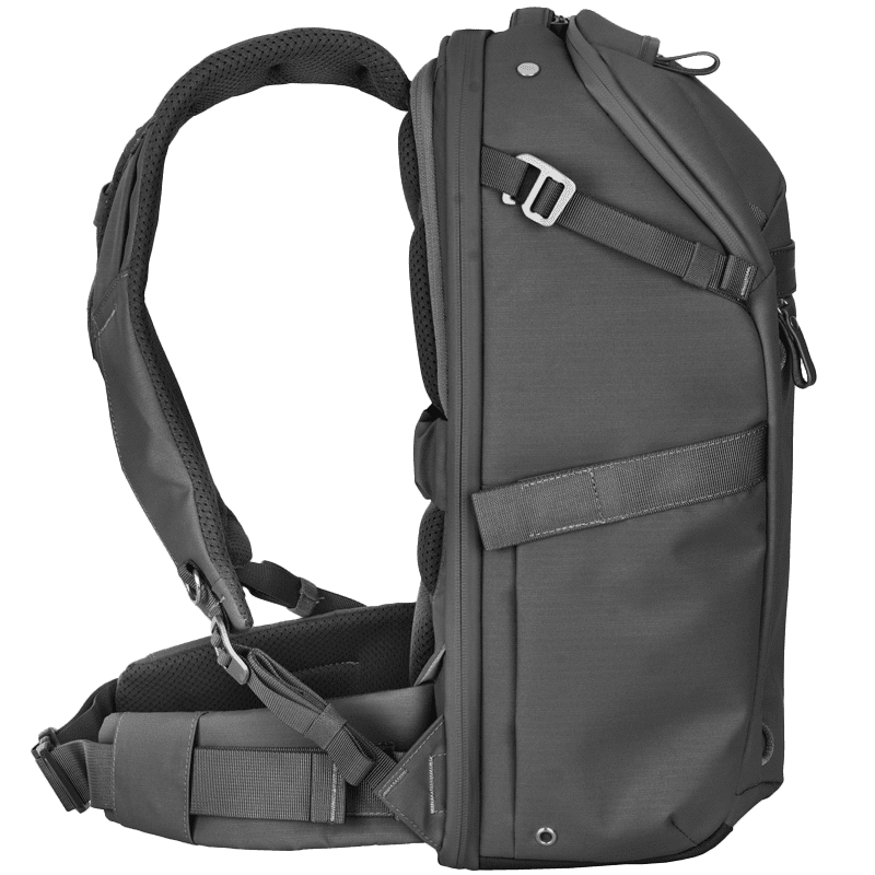 Der VEO METRO B25L ist ein leichter 25-Liter-Rucksack, der den IATA-Richtlinien für Handgepäck entspricht. Er verfügt über ein unteres Kamerafach, ein abnehmbares oberes Tagesfach, ein gepolstertes Laptopfach für Geräte bis 16 Zoll sowie erweiterbare Seitentaschen für Stativ oder Wasserflasche.