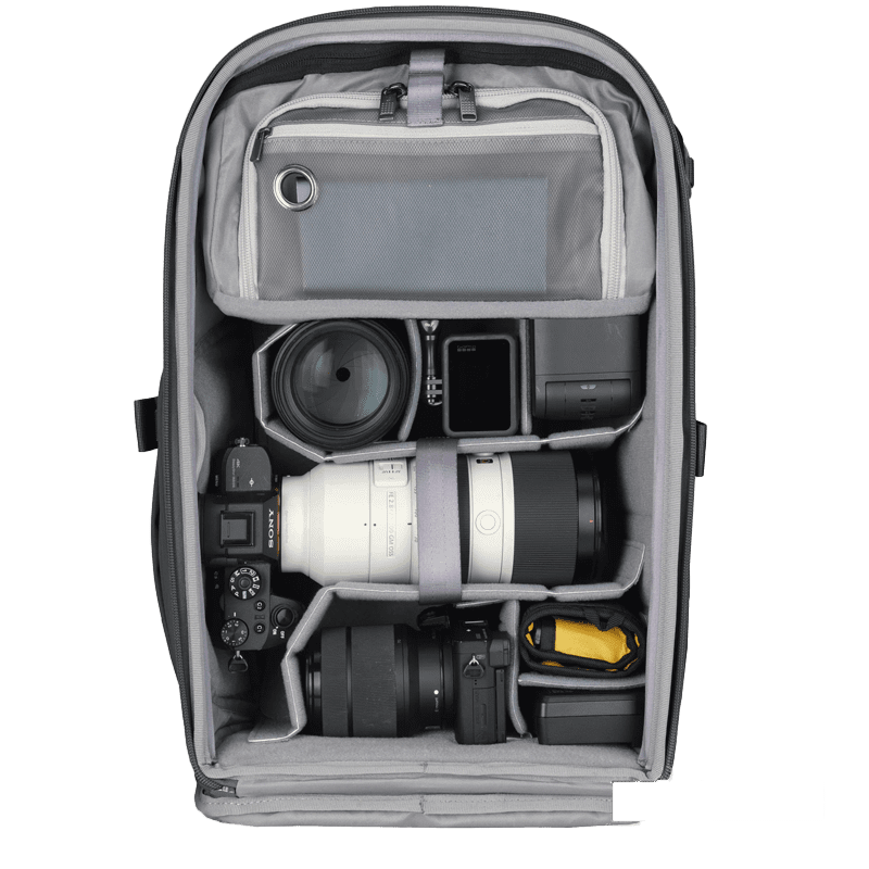 Das Kamerafach bietet Platz für eine Profikamera mit bis zu vier Objektiven (bis 70–200 mm f/2.8). Flexible, schmale Trennwände schützen die Ausrüstung und können individuell angepasst oder entfernt werden, um den Rucksack auch für den Alltag zu nutzen. Der Zugriff erfolgt sicher von hinten und oben, mit schnellem Zugriff von der Seite.